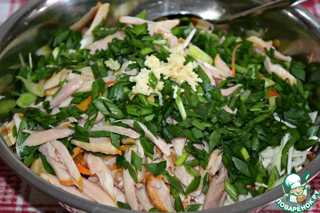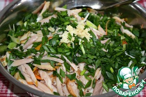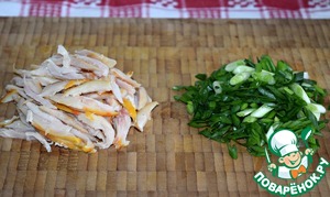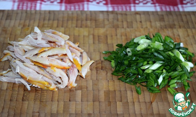 Курицу (я готовила из копченой куриной грудки) нарезать соломкой или разобрать на волокна. -