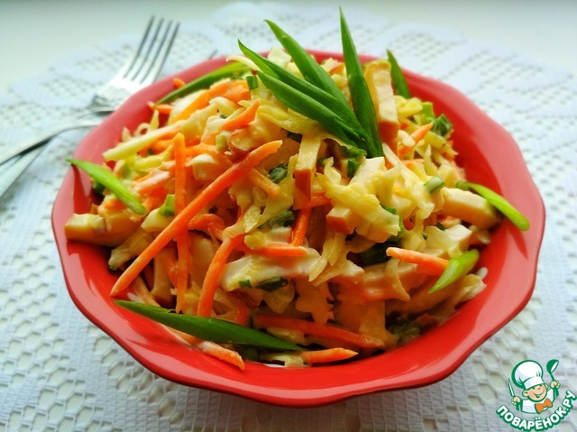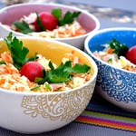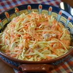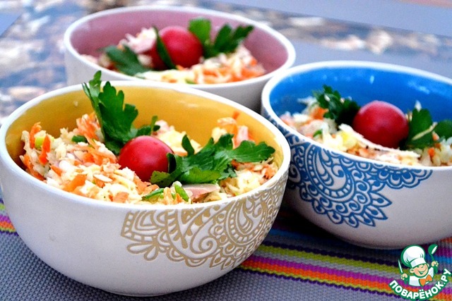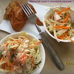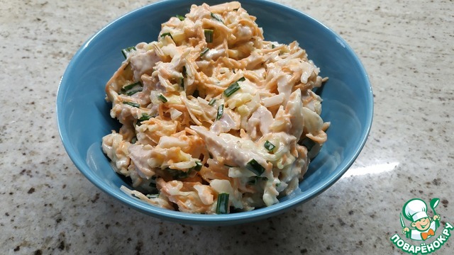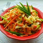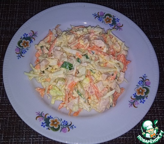 Яркий, сочный, хрустящий, чуть пикантный салат из моркови, капусты и копченой курицы. Вкусный! Сытный, но не тяжелый. И готовится очень быстро. Угощайтесь!