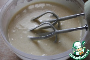 Соединить "сухие" и "влажные" компоненты, хорошо перемешать. Медленно добавить горячую воду и смешивать на низкой скорости.