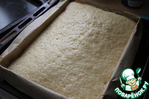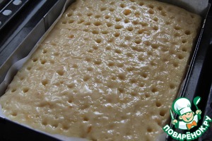 Духовку разогреть до 180 градусов. Тесто вылить в подготовленную форму (22см х 32см) и выпекать около 30 - 40 минут (лучинка должна выходить с несколькими влажными крошками)