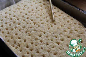 Дать основе остыть. Коктейльной трубочкой большого диаметра сделать дырочки по всей поверхности коржа.