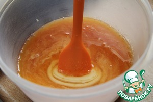 Подготовить заливку: смесь желе залить горячей водой. Размешать до однородной прозрачной жидкости. Смешать со сгущенным молоком.