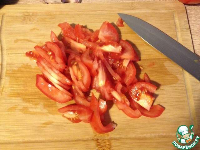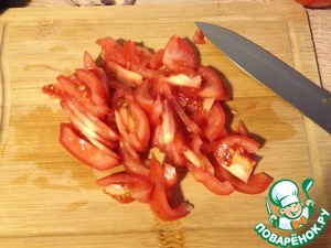 Помидоры нарезать дольками, если помидоры крупные, можно дольки еще пополам разрезать.