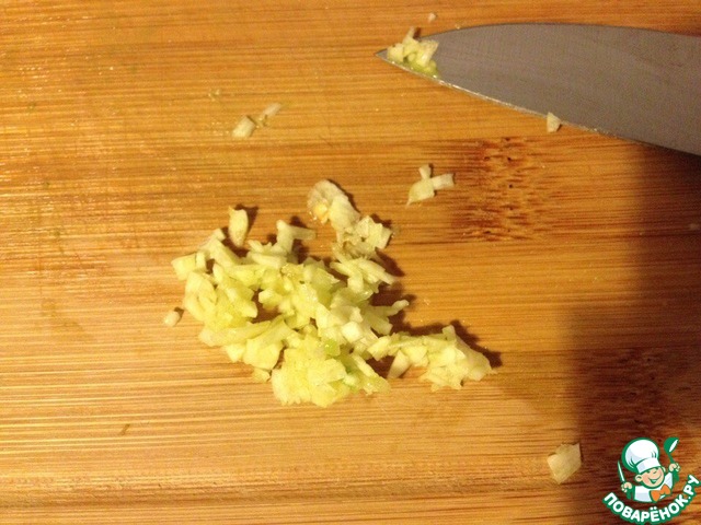 Чеснок пропустить через чеснокодавилку. Если ее нет, то можно плоским лезвием ножа раздавить зубик чеснока и мелко-мелко нарезать.