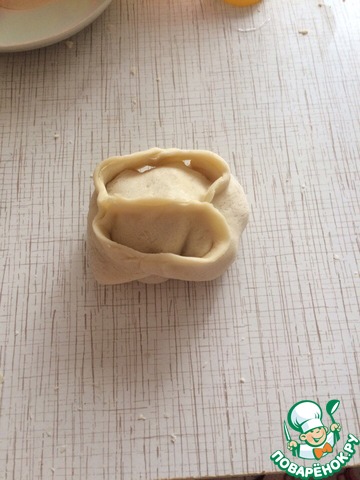 Кружочек немного растягиваем в руках и выкладываем начинку - полторы столовых ложки.