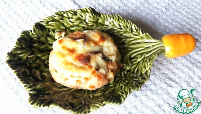 • В мясные лодочки выложить слой жаренных грибов и залить их сверху соусом.