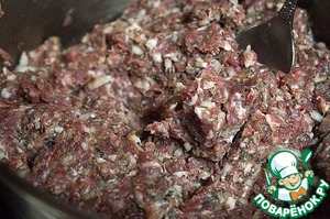• Смешать фарш, остальные ингредиенты, влить коньяк, посолить, поперчить, тщательно вымесить. Дать фаршу немного постоять.