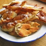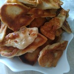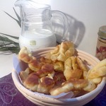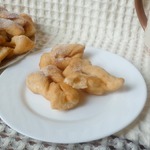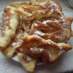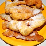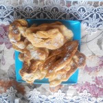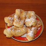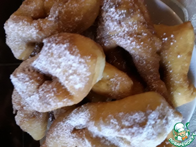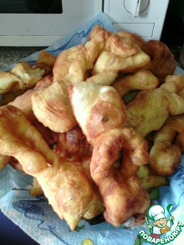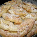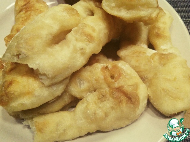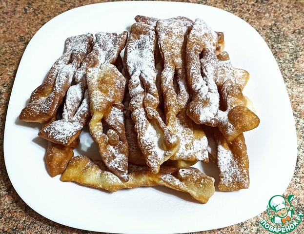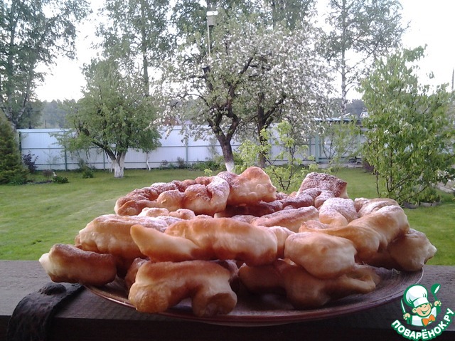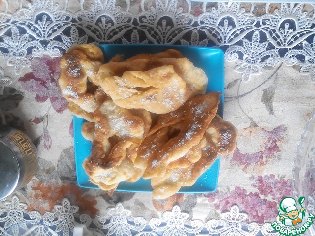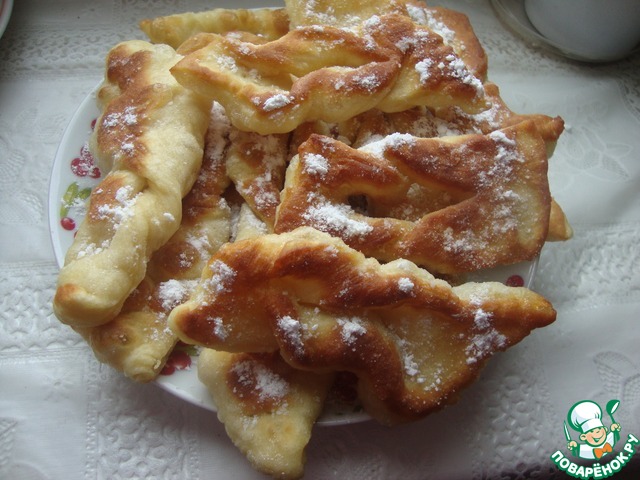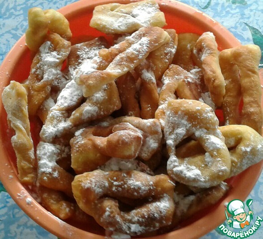Это немецкая выпечка – кребли. По своей форме напоминают хворост, потому что тесто формируется также. Но для хвороста тесто делается таким, чтобы после жарки оно получалось хрустящим. А у креблей тесто мягкое, воздушное и по структуре напоминает пончики. Кребли можно делать сладкими, добавив сахара или чуть солеными и кушать с другими блюдами вместо хлеба.