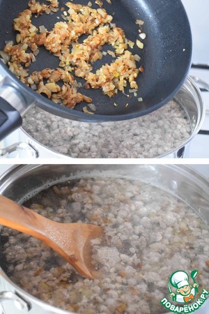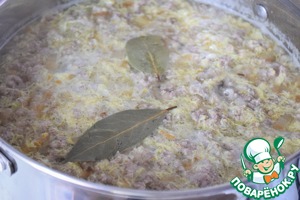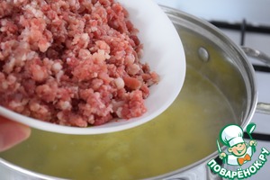 Добавить фарш, хорошо перемешать, огонь убавить до минимального и варить около 10-15 минут.
