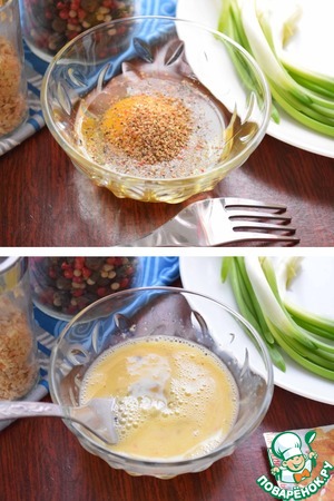 Яйцо разбить в небольшую чашку, добавить перец, куркуму и хорошо взбить вилкой.