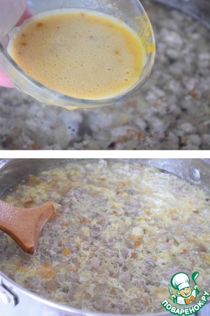 Тонкой струйкой, постоянно помешивая, добавить в кастрюлю взбитое яйцо.
