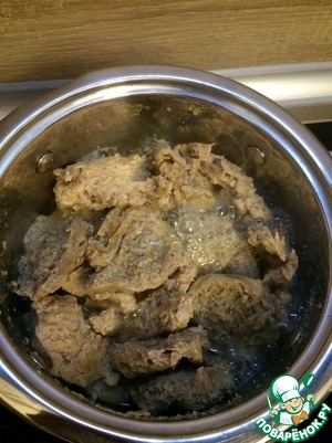 • 1. В кипящей подсоленной воде отвариваем соевое мясо, откидываем его на дуршлаг и слегка отжимаем.