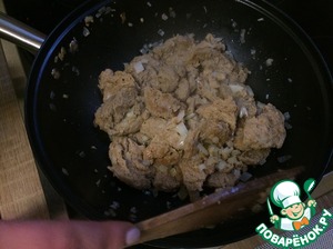 • 4. К луку добавляем соевое мясо, обжариваем 5 минут, постоянно помешивая.