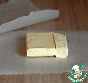 Пока тесто отдыхает, приготовьте масло для слоения. Поместите холодное масло хорошего качества и высокой жирности между двумя листами пергаментной бумаги. Выровняйте скалкой в квадрат примерно 20 на 20 см.