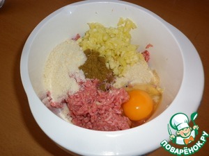 В фарш добавляем пармезан, молотые сухари, яйцо, мякоть цуккини и кумин (зиру). Солим, перчим.