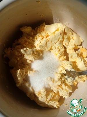 Для начала сварить 3 яйца и отделить желтки ( белки не нужны). Соединить их с размягченным маргарином ( не топленым!). Добавить сахар.