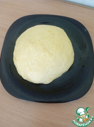 Смешать с просеянной мукой и разрыхлителем. Примерно 15 ст. л. без горки. Тесто должно быть как мягкий пластилин и не липнуть к рукам. 1/3 часть кладем в морозилку. Остальное выкладываем в форму для запекания и делаем высокий бортик. Я делаю слой в пол сантиметра. Накрываем пленкой и оставляем.
