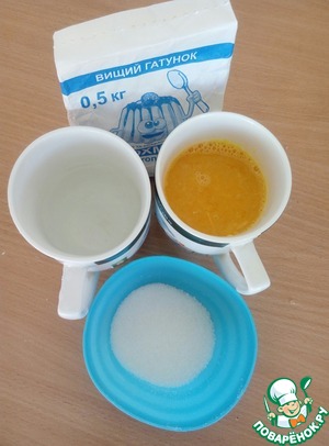 Выжимаем сок из апельсинов. Ставим на плиту и добавляем сахар. Помешивая доводим до кипения и уменьшаем огонь. Разводим крахмал в воде. Вливаем в кипящий сок. Постоянно мешаем до загустения и снимаем с плиты. -