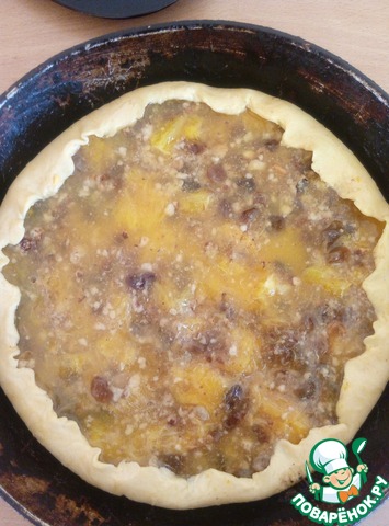 На тесто кладем апельсин, орехи, изюм, корицу. Выливаем заливку и заворачиваем края.