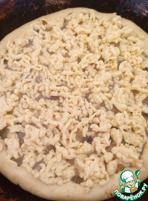 Достаем тесто из морозилки и натираем на терке. Посыпаем пирог. Ставим в разогретую до 160-180°C духовку на 30 мин. Температуру и время регулируйте под Вашу печь.