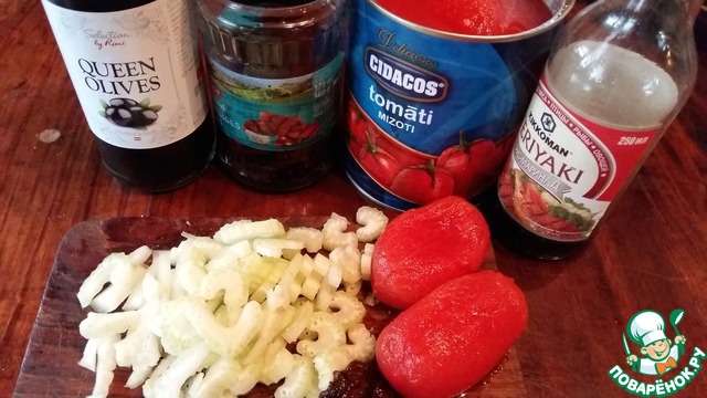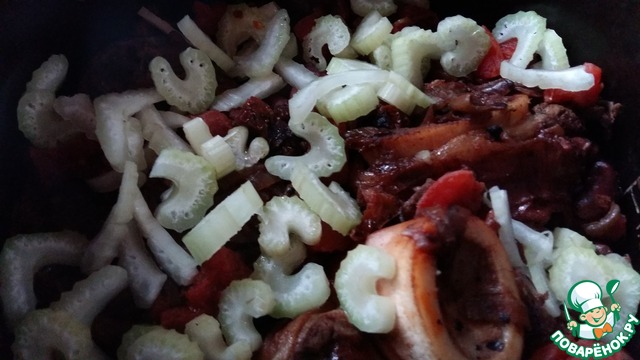 Установить режим "Тушение" на 2 часа. За 10 минут до готовности добавить к блюду нарезанный тонкими ломтиками черешковый сельдерей и маслины.