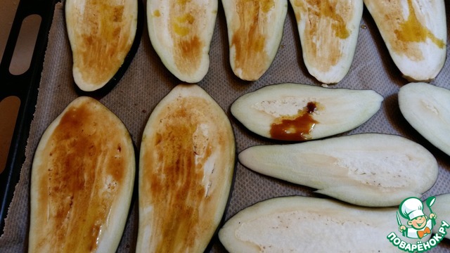 Баклажан нарезать тонкими ломтиками, смазать соевым соусом и запечь в духовке до готовности.