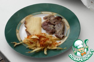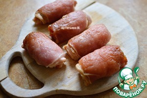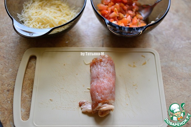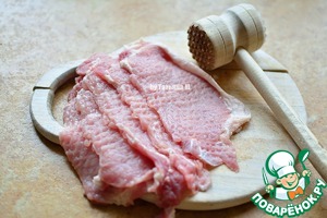 Так как отбитое и промаринованное мясо достаточно липкое, то скреплять шов ничем не нужно, он и так слипается; -