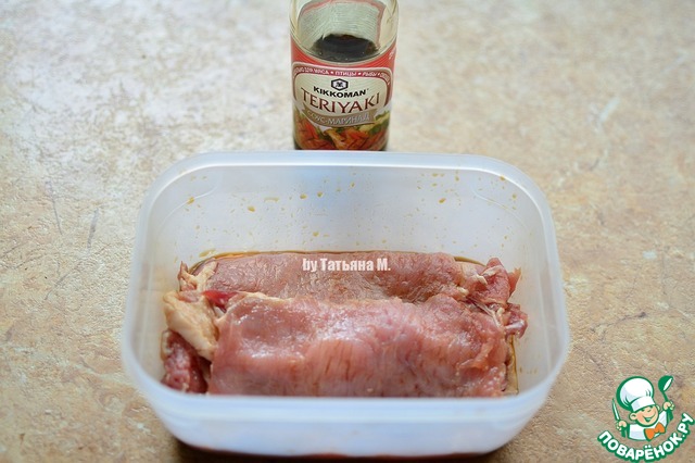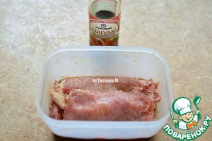 Залить соевым соусом мясо и, иногда переворачивая в соусе, мариновать 40 минут;