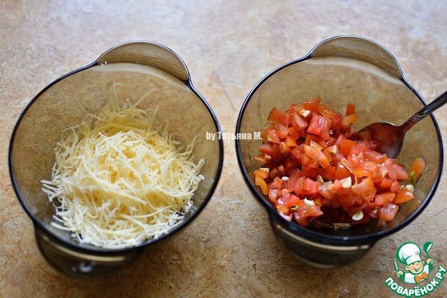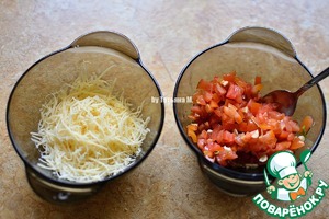 Пока маринуется мясо, натереть на мелкой терке - сыр и приготовить сальсу, для этого порезать маленькими кубиками помидор, добавить рубленный чеснок и базилик, чуть присолить и поперчить по вкусу - размешать;