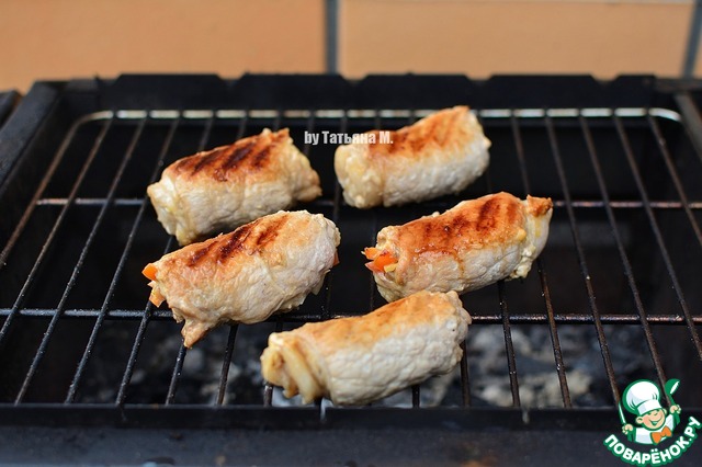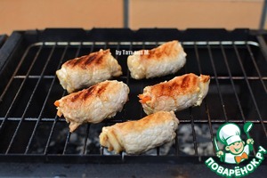 Жарить рулетики на умеренно-жарких углях, начиная со стороны шва, придавив к решетке все рулетики плоской тарелкой;