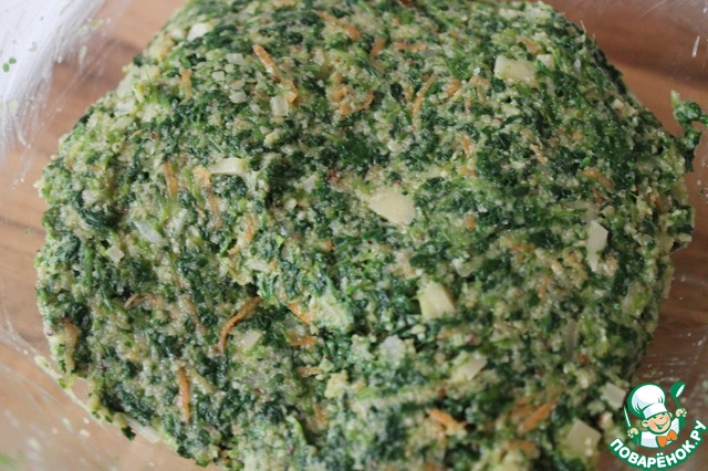 В миске смешиваем шпинат, сыр, сухари, лук, чеснок, морковь, орехи. Добавим полтора яйца. Я обычно отделяю немного белка и желтка от второго яйца. Если яйца маленькие, можно добавить и два. Перемешиваем, посолим.