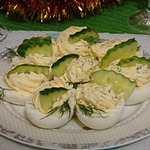 Вилкой измельчить желток. Добавить к нему творожный сыр, чеснок пропущенный через пресс, соль, перец и укроп мелко нашинкованный. Все тщательно перемешать. При желании можно добавить ложку майонеза. Начинкой нафаршировать яйца. Огурец нарезать ломтиками и воткнуть по центу в каждую половинку яйца. Украсить веточкой укропа.