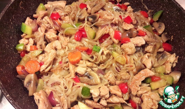 Параллельно отвариваем лапшу по инструкции на упаковке, она не должна быть разваренной, достаточно 4-5мин, добавляем к овощам и курице, добавляем специи (в том числе имбирь и раздавить чеснок/мелко нарезать) и соусы, еще 2 минуты на сильном огне при постоянном помешивании. Все!