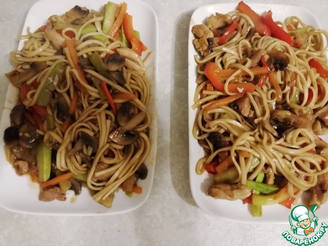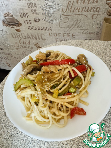 Удон - любой домашней яичной лапшой. Я покупаю лапшу для бешбармака (её проще найти, и она дешевле), подвариваю буквально 2-3 минуты на бульоне - и кидаю к овощам. Получается очень быстро, очень дешево и очень вкусно.