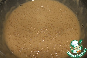 Яйца взбить с сахаром в пену, добавить ванильный сахар и разрыхлитель, влить коньяк.