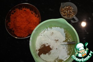 Затем добавьте муку, корицу, соду и разрыхлитель. В последнюю очередь добавьте морковь и орехи.
