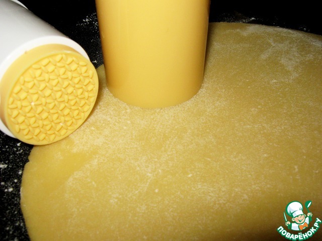 Толщина теста должна быть примерно 3-4 мм. Удобно раскатывать между двумя разрезанными одноразовыми пакетами. За счет этого тесто не "забивается" мукой.