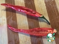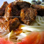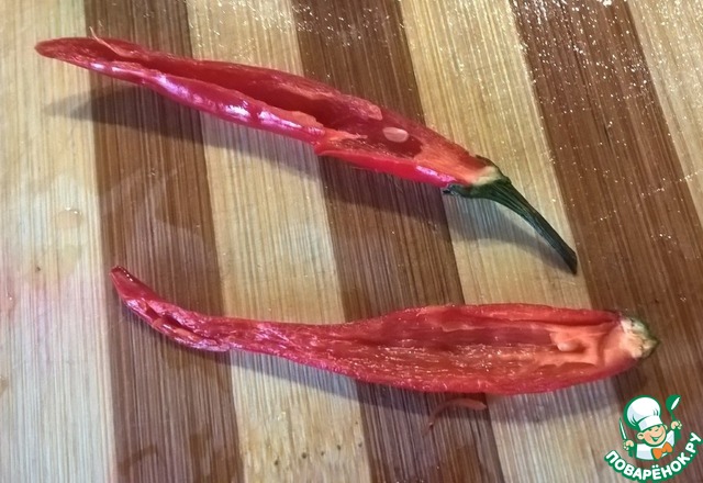 Выложить на дно глубокой формы мясо Сверху залить томатным соусом (из него можно убрать перец, если боитесь остроты) Запекать в духовке 50 минут Приятного аппетита!! |