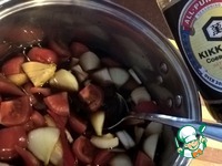 Соевый соус Kikkoman смешать с водой и жидким дымом Добавить лук, перец и помидоры Варить на медленном огне 10-15 минут |