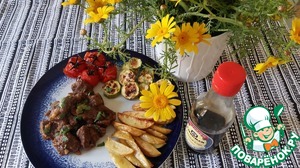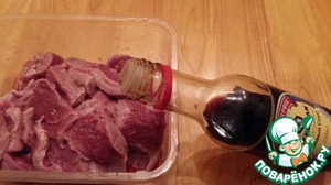 Мясо нарезать кусочками средней величины, посыпать приправой /у меня смесь сладкой и острой паприки и молотых сушенных томатов/. Выжать сок 1/2 лимона и замариновать вместе с луком в соевом соусе от ТМ "Киккоман". У меня мясо мариновалось сутки.