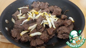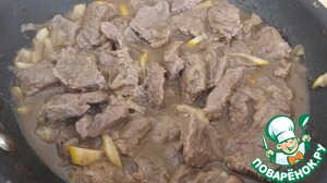 Мясо обжарить на большом огне для образования корочки. Снять с лимона цедру вместе с ее белой частью, порезать тонкими ломтиками и добавить к мясу.