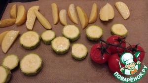 Молодую картошку и кабачки порезать ломтиками и обвалять в растительном масле. Овощи я планировала запекать на гриле, но т. к. погода не позволила этого сделать пришлось отправить их в духовку. При максимальной t овощи запекаются 10 - 15 минут. Посолить уже в готовом виде.