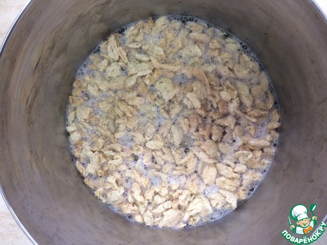 1. Готовим начинку для блинчиков. Отвариваем соевый фарш в подсоленной воде.