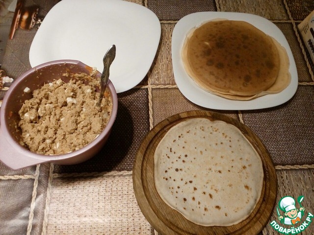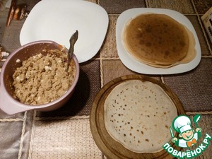 4. В емкости смешиваем соевое мясо, пассерованные овощи, яйца и специи. В готовые блины заворачиваем начинку. Подаем с любым соусом или сметаной.