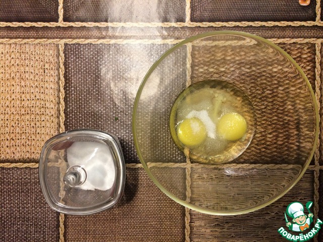 • 1. В подходящей емкости взбить яйца, сахар, соль.