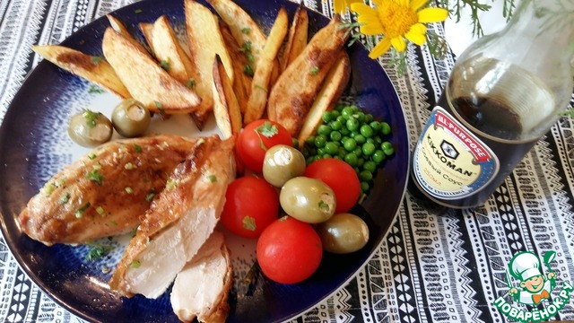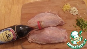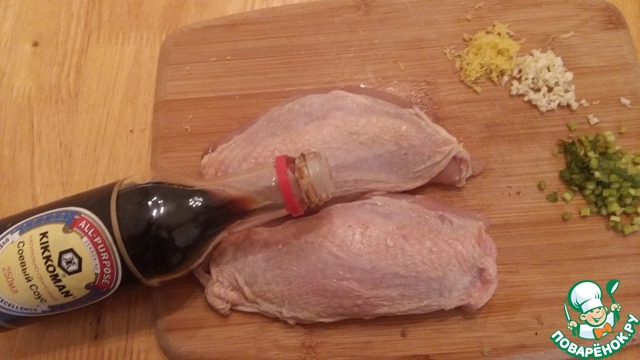 Куриное филе замариновать в соевом соусе от "ТМ Киккоман". У меня курица мариновалась 12 часов.