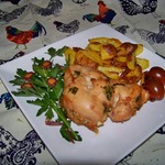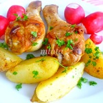 Одновременно с курицей можно запечь и картошку. Для этого ее надо нарезать ломтиками и полить растительным маслом. Посолить картошку нужно уже в готовом виде.