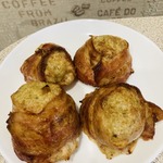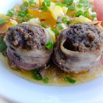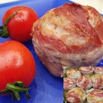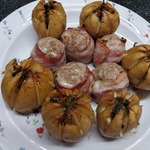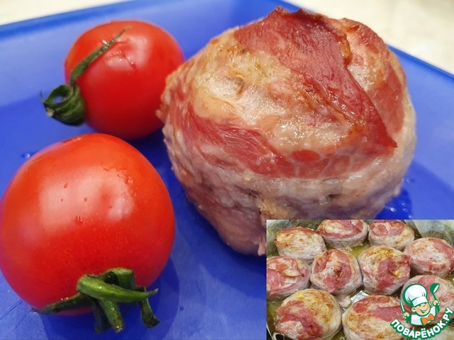 Обмотать каждый мясной шар пластинкой бекона и закрепить ее зубочисткой.
