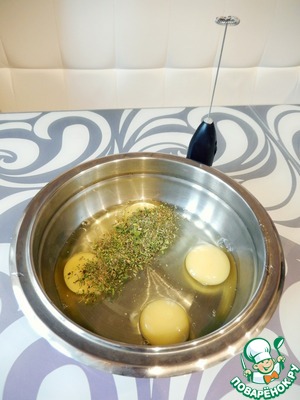 Смешиваем в ёмкости, где будем готовить начинку, специи и 4 яйца. Взбиваем, пока масса не станет однородной.