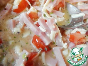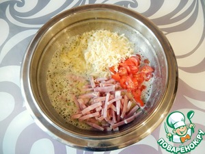 P.S. Не высыпайте все ингредиенты сразу, т. к. яйца у вас могут быть другого размера и количество ветчины, сыра и помидор необходимо будет варьировать. -